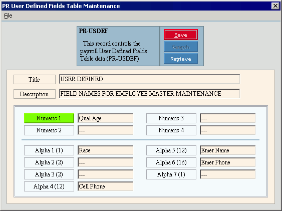 Use PR User Defined Fields Table Maintenance to maintain the labels of the User-Defined Fields, which you can maintain during Employee Master Maintenance in the User Defined Fields Area. There are four numeric fields and seven alphanumeric fields that your facility can use for their own purposes.