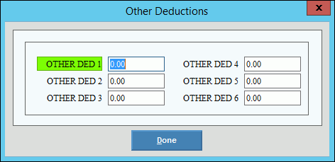 Enter the amount for the appropriate other deduction(s). (3.2 numeric) Note: Each amount relates to a General Ledger Account Number defined in the O DED Table. |
