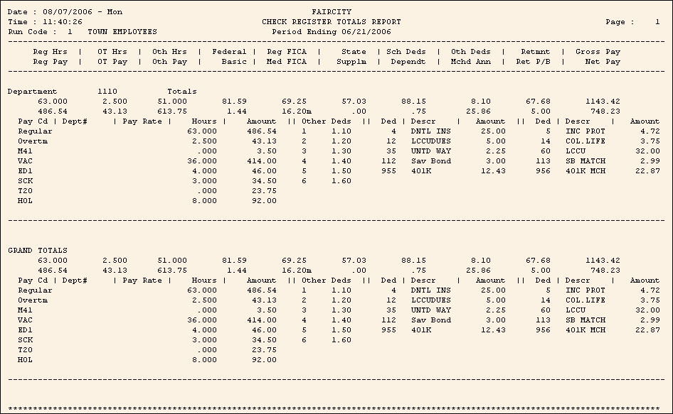 To see instructions for running the report shown below, refer to the Payroll Check Edit Register Instructions, Payroll Check Register Instructions, and Permanent Payroll Check Edit Register Instructions.