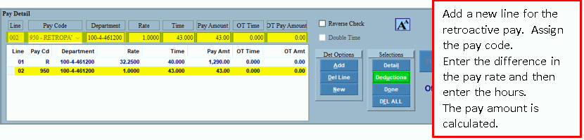 Example: An employee earns a $1.00/hour raise and it is retroactive for the last 6 weeks. Look up the hours worked then multiply the $1.00/hour raise x hours as shown in this example below.