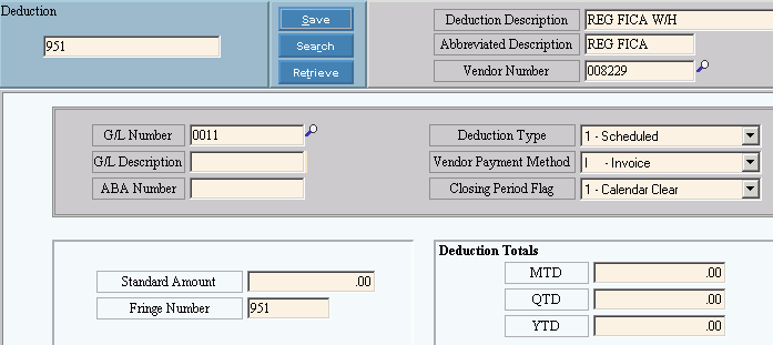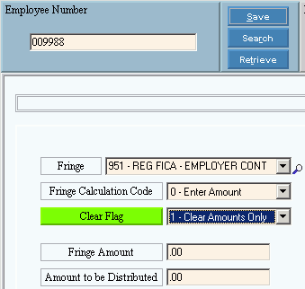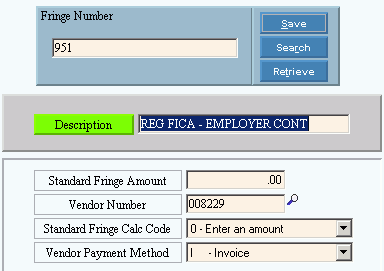 To set up a fringe using Fringe Calculation Code 0 (Enter the Amount) for the employer's portion, you need to set up a Deduction Code for the employee's portion and a Fringe Number for the matching employer's portion. The Payroll Post program uses the Deduction Code entered in the PRINVCHK table for the standard deductions for every employee. Because FICA is a standard deduction, you do not assign the Deduction Code to individual employees, as you would with scheduled deductions.
