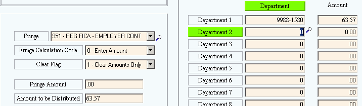 This example depicts how to use Fringe Calculation Code 0 - Enter the Amount, which specifies how the Payroll Post calculates the fringe distribution amounts and then enters the values automatically into the Employee Fringe file.