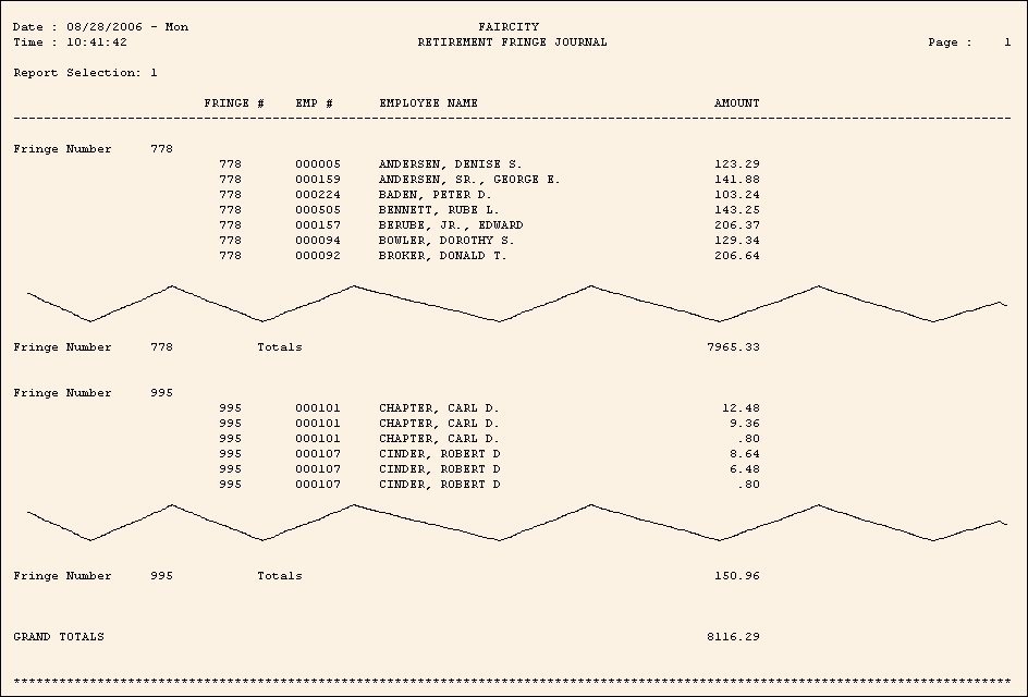 To see instructions for running the report shown below, see the Retirement Fringe Journal Instructions.