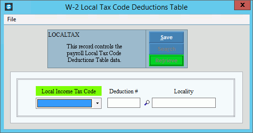 W-2 Local Tax Codes Table Maintenance Window Example: