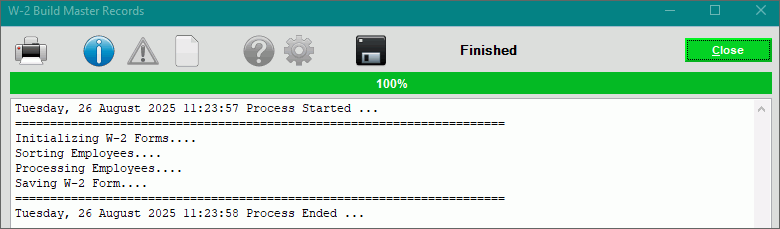 To close the screen when Process Complete displays and the routine is finished, click Close. Keyboard shortcut: [ALT + d]