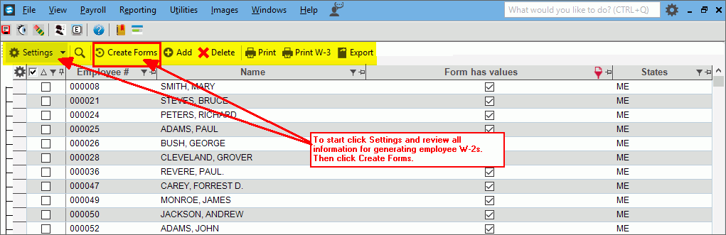 Use the W-2 Processing to generate, edit and print employee W-2s. In addition, you can generate a file for submitting the employee W-2s electronically to the IRS.