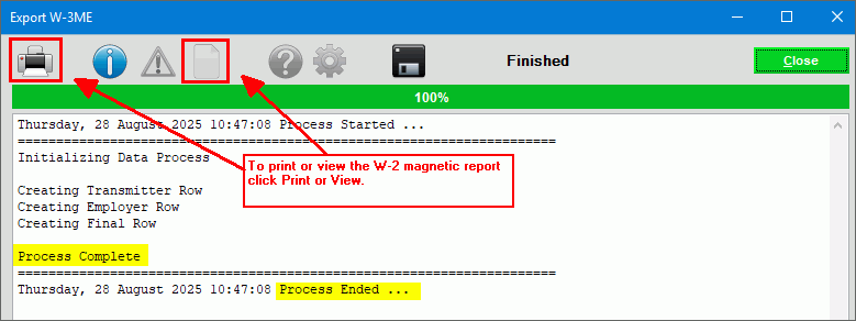 W-2 Export File Processing Window Displays information pertaining to the W-2 Export process to guide you. When the export is finished, print the W-2 Magnetic File report by choosing the options below.