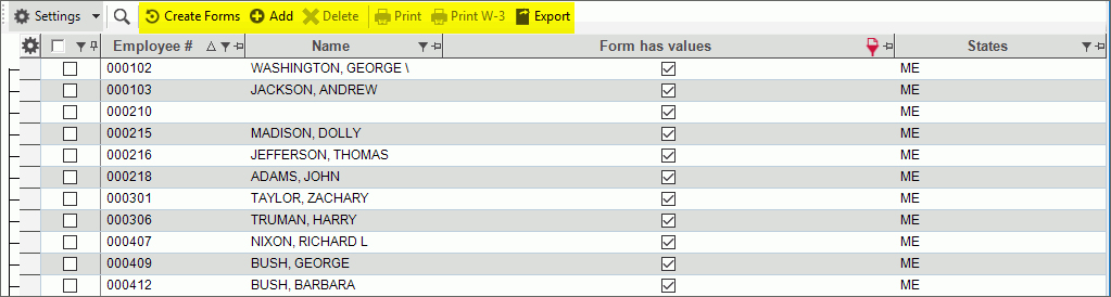 Organizing Employee W-2 ListThe employee W-2s display in a list, which can be sorted by any of the columns and filtered to narrow the list of w-2s, if needed.
