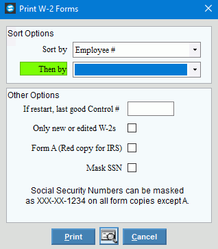 To truncate the display of the employee social security number on the W-2s, check this box. To display the full employee social security number on all copies of the W-2s, leave this box unchecked. |