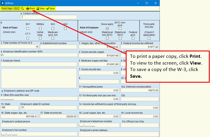 Print W-3Use W-3 Print to print the summary totals for your W-2s. You can use this function if you are submitting paper W-2s. To start, click Print W-3 and the following screen displays. Note: You only need to print W-3 if you submit paper W-2s to the IRS.