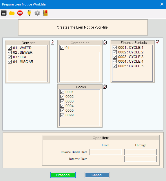 Generally, the Liens Prepare Notice Workfile routine is the second step in the process of generating liens. For information on the lien process, see the Liens Process.