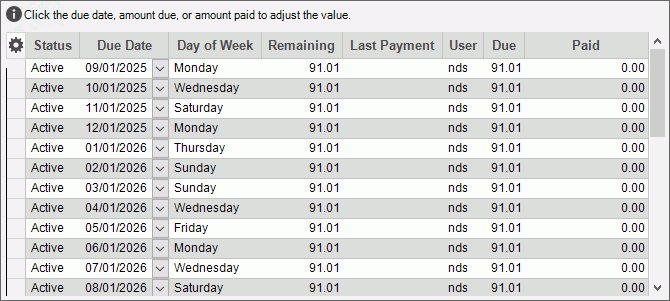 Plan Details Pane After the plan term, frequency and start date are entered, the plan details display in the Details pane. Details include the plan status, due date for each payment, amount due, amount paid on the due amount, remaining balance, last payment date, and the user who created the plan. You can edit the due date, amount due and amount paid fields if needed.