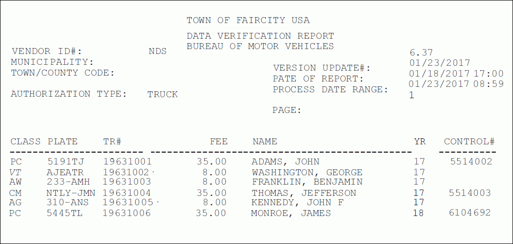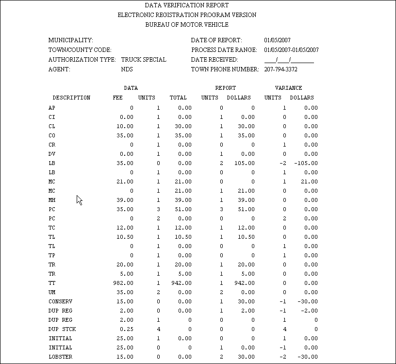 The Electronic Registration Export Data Verification Report provides a two-part report. The first part lists the registration records in the electronic registration export work file and the second part provides a comparison of the work file information to the Town Detail Report.