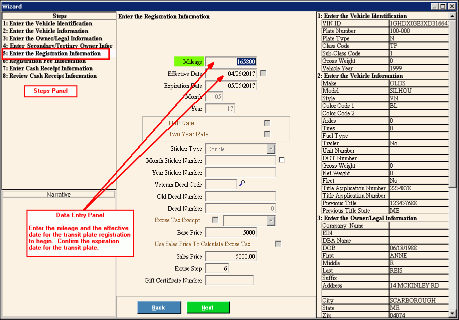 Use the Enter Registration Information Step to enter the registration information for the vehicle including the mileage, effective date, and vehicle base price. The table following the panel example describes the data entry for this step in the Transit Plate Registration Wizard.