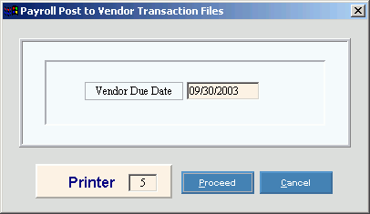 The Post to Vendor Transaction Files process creates invoice and check transactions for the Vendor Invoices and Checks programs. If you choose to use the dual posting option, this program processes the data for the Vendor Invoices and Checks system before running the Payroll Post. Splitting up the posting tasks into two programs may be useful for auditing this portion of the post separately. If you choose the single posting option, the Payroll Post handles the updates for the Vendor Invoices and Checks.