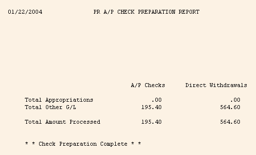 The PR A/P Check Preparation Report prints the total Invoice Amounts for the checks that have been prepared for printing.