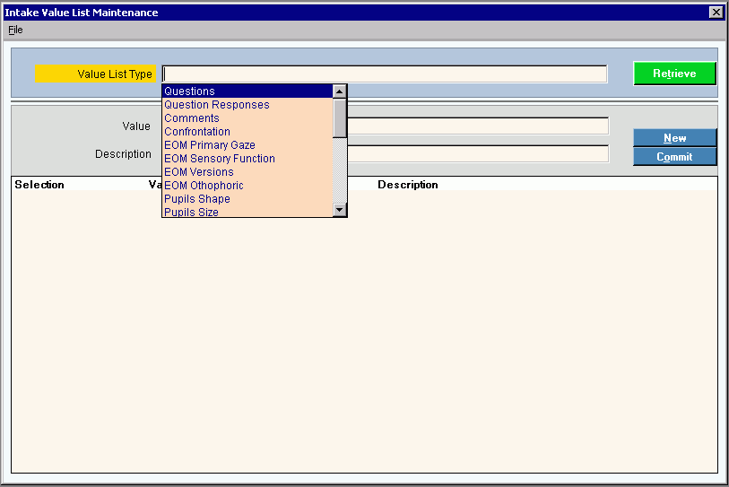 To display an existing value list, click the desired Value List Type and click Retrieve, or press [ENTER]. Keyboard shortcut: [ALT + t] |