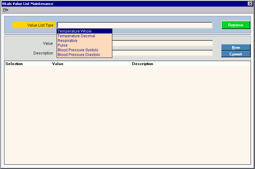 To display an existing value list, click the desired Value List Type and click Retrieve, or press [ENTER]. Keyboard shortcut: [ALT + t] |