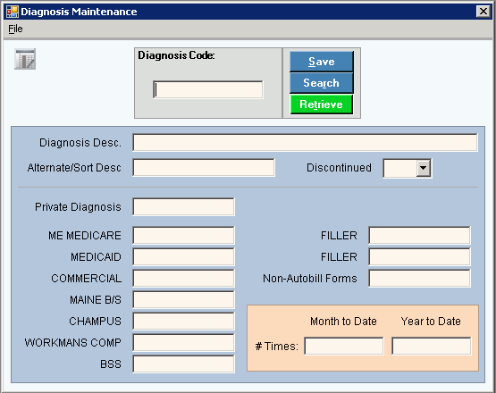 Use Diagnosis Maintenance to maintain Diagnosis Codes and the specifically required format of those codes for each insurance. You can maintain a different code for each of the nine insurance Form Types. You can see statistics showing the number of times a doctor made a specific diagnosis during the current period or year. In addition, you can assign the Diagnosis to the EPM Value List which means the Diagnosis Code will display in the appropriate drop-down lists during EPM.
