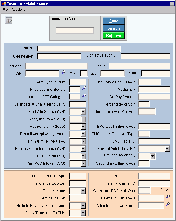 Use Insurance Maintenance to maintain information about the insurance companies and their insurance plans. Each carrier is assigned an Insurance Code, which will be the basis for tracking your Aged Trial Balance. Use Insurance Maintenance to maintain demographic information, plan limits, co-pay amounts, Medigap Numbers, Accept Assignment flags, electronic billing controls and flags to verify certificate numbers.