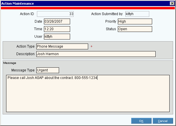 Use Action Maintenance to maintain information about an action on the Action Console. An action is a tickler item that you can track. Actions include to-do items, phone messages, meetings, and application-specific events such as account callbacks.