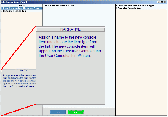 The Wizard Narrative Panel, which is located in the lower left side of the Wizard window, contains tips about the step currently displayed in the Data Entry Area.