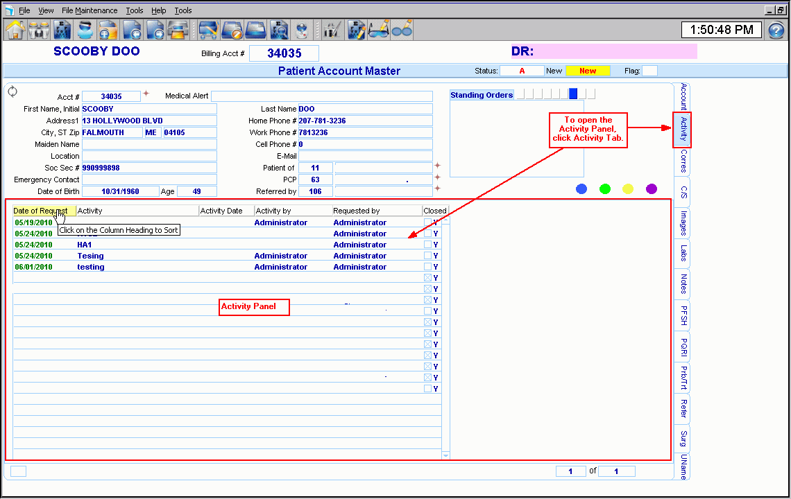 Use the Activity Event History Tab to track all follow-up activities and events that are associated with an encounter. The Activity panel displays the patient's activities and events. To view additional detail of a particular item you can click the appropriate green date. In addition, you can quickly see if an activity is open or closed. The table following the window example describes the Activity History Panel for Patient Account Master.