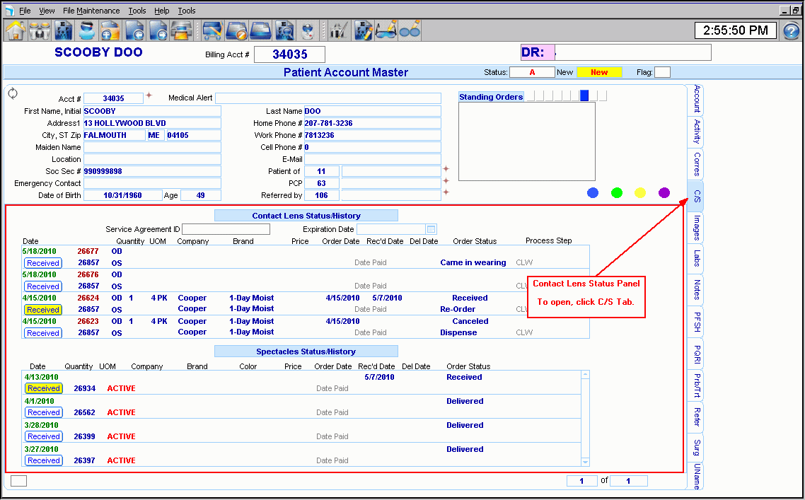 Patient Account Master - Patient Contact Lens Status Panel Example: