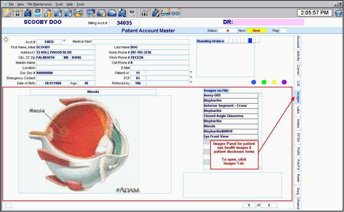 Use the Patient Images Panel to store and view unlimited images by Patient with the ability to compare up to 4 side by side at the click of the “Patient Image” menu item. Patient Disclosures and Forms on File: INSight EPM allows you to record all Patient Disclosures and Forms on File for HIPAA. You can review them at any time with the click of the “Discl/Forms” button on the right. The table following the window example describes the Patient Images Panel for Patient Account Master.