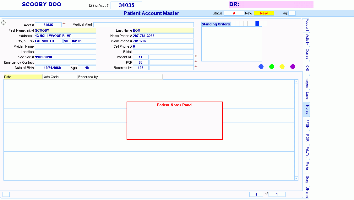 Use the Patient Notes Panel to store unlimited Patient Notes and Messages. You can review them at any time with the click of the “Notes” menu item. Simply click the green date . The table following the window example describes the Patient Notes Panel for Patient Account Master.