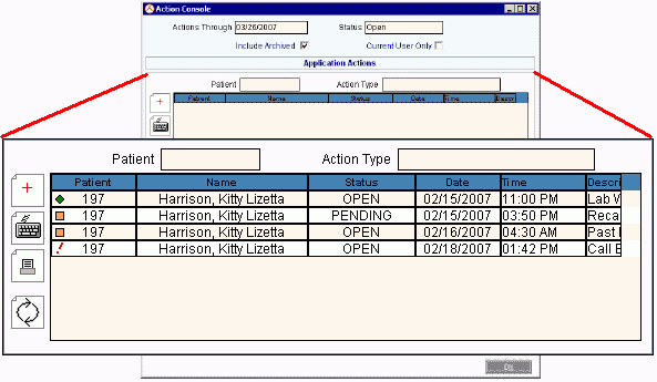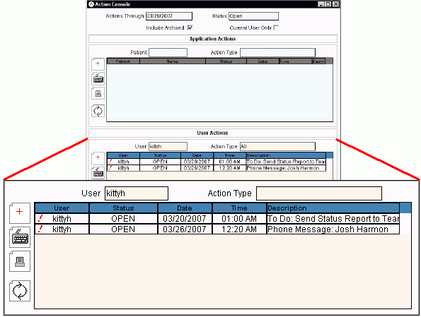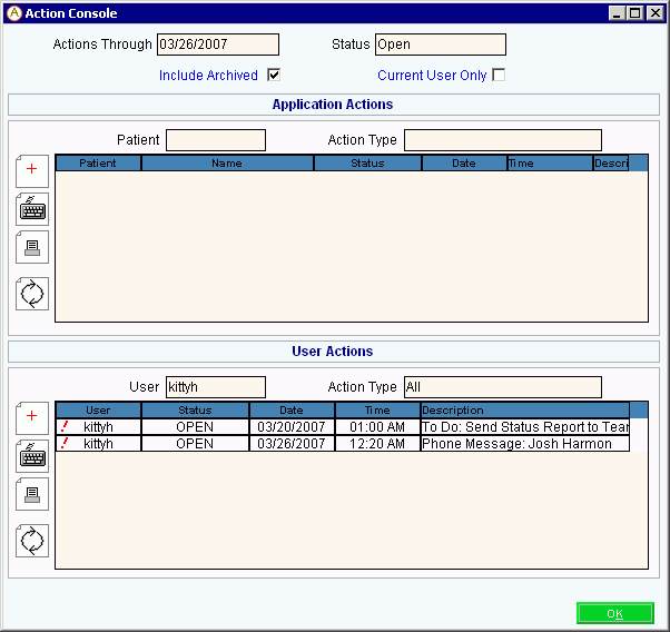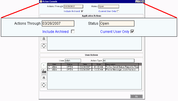 Use the Action Console as a triage and tickler system, which allows you to track action items and application specific events, such as callbacks, meetings, and phone calls.  There are two major areas of the Action Console: