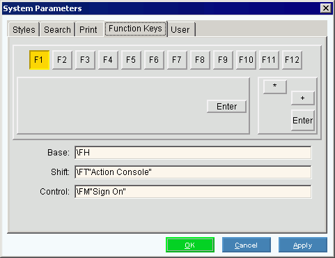 Use the Function Keys tab for programming the function keys [F1] through [F12] to quickly perform commands according to your personal needs. In addition to [F1] through [F12] you can combine a function key with [CTRL] or [SHIFT] allowing you to program up to 36 function keys. Function Keys are different than keyboard shortcuts. A Function Key can be assigned to perform many operations or commands in addition to menu selections. Function keys are assigned at the PC level.