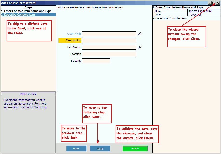 A Wizard guides you through the data entry tasks in an organized manner, while giving you the flexibility to skip around as desired. See the example below to learn how to navigate within the window and how to close the wizard.