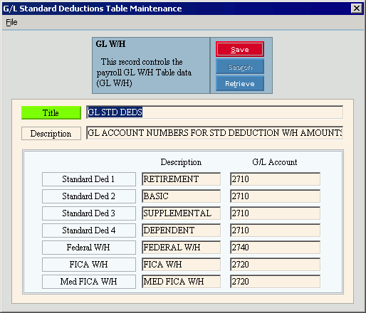 Use G/L Standard Deductions Table Maintenance to maintain General Ledger Account Numbers used by the Payroll Post to create journal entries for retirement and standard tax withholding amounts.