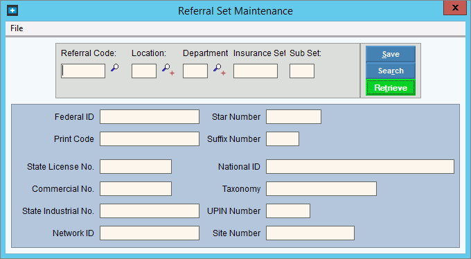 To display an existing referral set, enter the Referral code, Location code, Department code, Insurance set, and Sub set, then click Retrieve, or press [ENTER]. Keyboard shortcut: [ALT + t] |