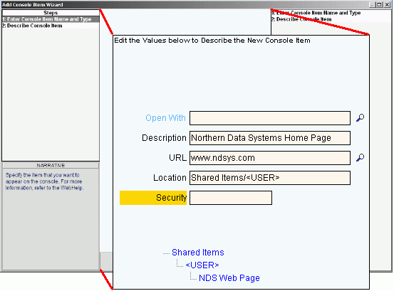 Enter the Internet address for the web page that you want to add to the consoles. (unlimited characters) Example: www.ndsys.com Tip: This field is active only if you specify "Web" for the Console Item Type. |