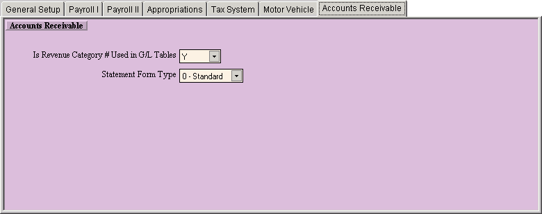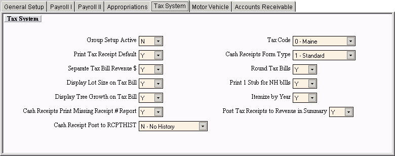 Tax System Tab Prompts Note: The following options apply to the Cash Receipts and Tax Billing modules. |