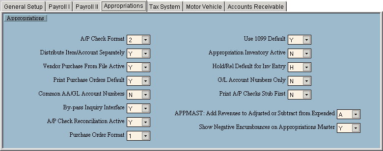 To specify if both Appropriation and G/L Account Numbers are used, click one of the following options in the drop-down list: