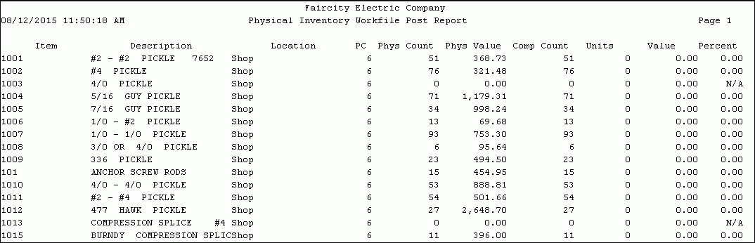 The Physical Inventory Post Work File Printout lists all items that are updated. It looks similar to the Physical Inventory Variance Report.