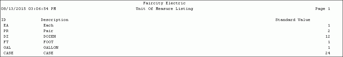 To see instructions for running the report shown below, see the Unit of Measure Listing Instructions.