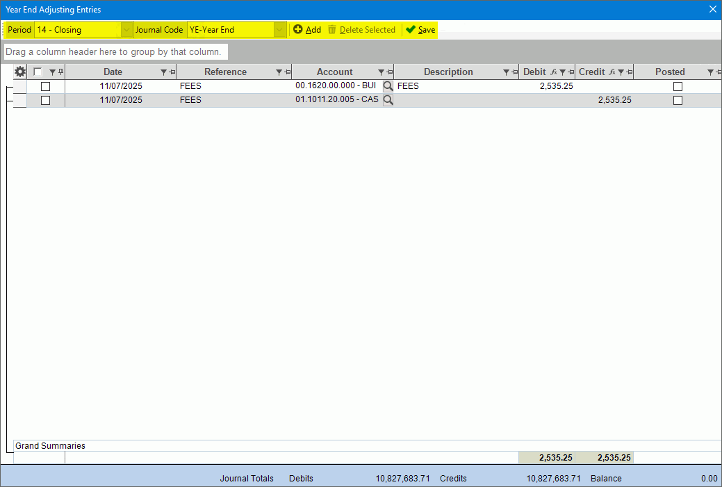 Use the Adjustments Processing to enter year-end adjusting journal entries for the General Ledger and post entries to the accounts. All entries are automatically posted with a journal code of YE to period 14. Standard, recurring and step-down allocations are not available in Year End Adjustments Processing.