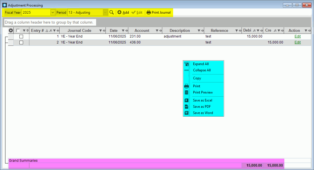 Print Adjustments Journal Use the Print Journal to generate a adjusting entries list for period 14. You can select if you want to see posted or unposted transactions. To run the journal, click Print Journal. The following screen displays.