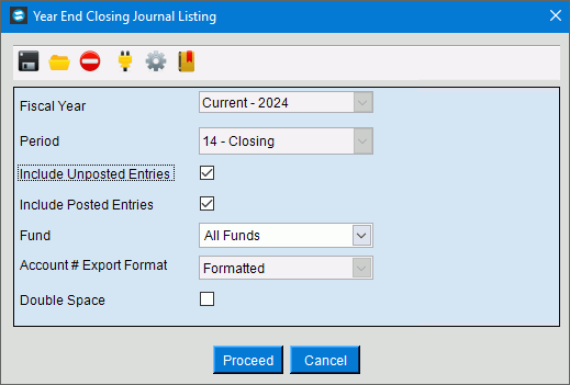 Use the Year-End Journal Listing to print year-end journal entry transactions for the closing Period, period 14. The closing transactions are generated by the Clear and Close Accounts routine and by Year-End Adjusting Entries Maintenance. You can select if you want to print posted or unposted transactions.