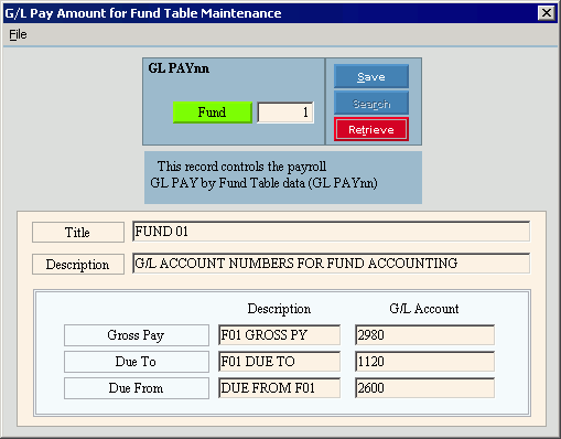 Use G/L Pay Amount for Fund Table Maintenance to maintain General Ledger Account Numbers used by the Payroll Post to create journal entries relating to Fund Accounting. The general purpose of this table is to transfer amounts from the cash account to the correct fund.