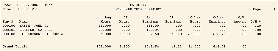 The Employee Totals Report prints the total hours and total earnings on a single line for each employee.