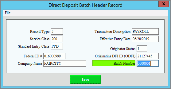 Use Direct Deposit Batch Header Record Maintenance to maintain the Batch Header Record for the direct deposit transmission file.