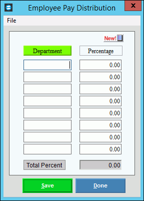 Use the Employee Pay Distribution Window in Employee Master Maintenance to set up the automatic allocation of the employee's hours and pay among multiple departments. Payroll Check Entry and Permanent Payroll Check Entry use the allocation to distribute the employee's pay to up to eight different Department Numbers. The table following the window example describes the fields in this window.