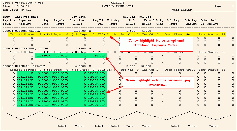 To see instructions for running the report shown below, see the Payroll Input List Instructions.