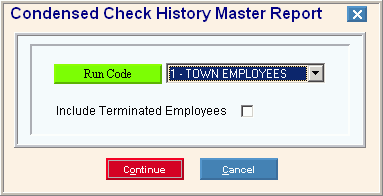Condensed Check History Master Report: Similar to the Check History Master Report, although the format compresses the printed lines. The condensed report does not include Other Pay Code totals, however it does include the deduction totals for each employee.