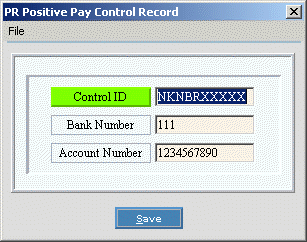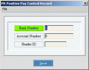 Use Positive Pay Control Record Maintenance to define the bank for the Positive Pay transmission file. The Positive Pay system transfers files to your bank to detect possible check fraud.